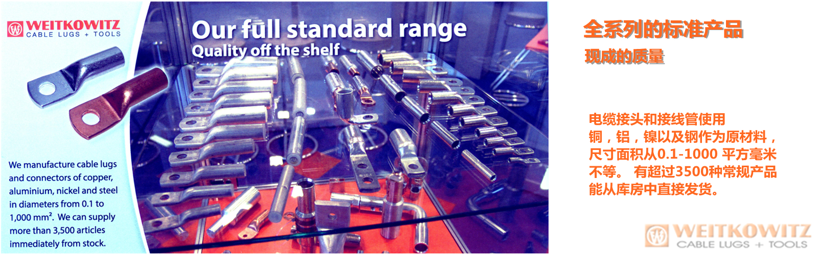 Weitkowitz公司是德国专业生产电缆端子,接地端子,压接工具以及电气连接和接地技术解决方案的百年企业。Weitkowitz产品分类广泛,选型齐全。满足不同客户对不同环境的需求。 从2002年开始,Weitkowitz开始在轨道交通方面拓展自己的产品 - 接地端子。由于极其出色的质量,得到了德国铁路公司的认证,从而在近几年中在轨道交通行业有着迅猛的发展。 Weitkowitz的产品经过各种权威机构的一系列的严苛认证,例如基于DIN EN 61373标准的震动测试(该标准是专用于轨交车辆上)以及德国劳氏船级社的认证 (造船行业)。 值得一提的是,盐雾测试结果表明,Weitkowitz的电缆线接头具有高耐腐蚀性,这一特性使得产品在造船和海洋工程中提供了良好的契机。 Weitkowitz通过不断的对自身工艺水平,产品流水线,企业管理的优化与提高,发展成一个面向客户需求,高度自动化生产以及在行业中具有顶尖的技术设计团队,这所有的一切,都是为了保证为客户提供最优的产品和最好的服务。 |